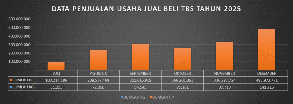 Periode operasional usaha jual beli TBS tahun 2025 tercatat aktif sejak bulan Juli hingga Desember, dengan total volume transaksi mencapai 552.233 kg TBS penjualan dan 538.038 kg pembelian. Selisih tersebut mencerminkan adanya proses grading dan penyusutan alami yang masih berada dalam batas wajar industri TBS.