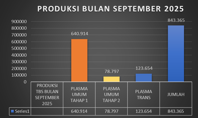 Pada September 2025, total produksi TBS tercatat sebesar 843.365 kilogram. Produksi tersebut berasal dari tiga kelompok pengelolaan, yakni Plasma Umum Tahap 1 sebanyak 640.914 kg, Plasma Umum Tahap 2 sebesar 78.797 kg, dan Plasma Trans sebanyak 123.654 kg.