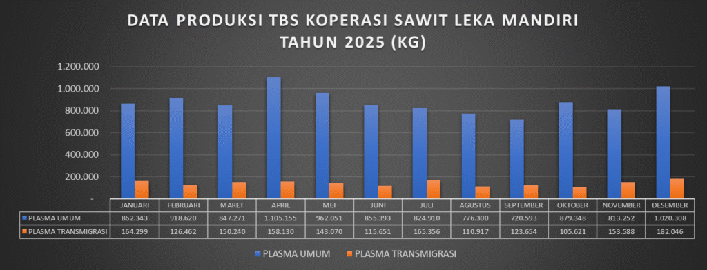 Koperasi Sawit Leka Mandiri mencatat capaian kinerja yang menggembirakan dalam sektor produksi Tandan Buah Segar (TBS) sepanjang tahun 2025. Berdasarkan laporan rekapitulasi produksi bulanan, total produksi TBS yang dihasilkan dari Plasma Umum dan Plasma Transmigrasi mencapai 12.284.578 kilogram atau lebih dari 12,2 ribu ton. Capaian ini mencerminkan kondisi kebun plasma yang relatif stabil serta pengelolaan produksi yang berkelanjutan.