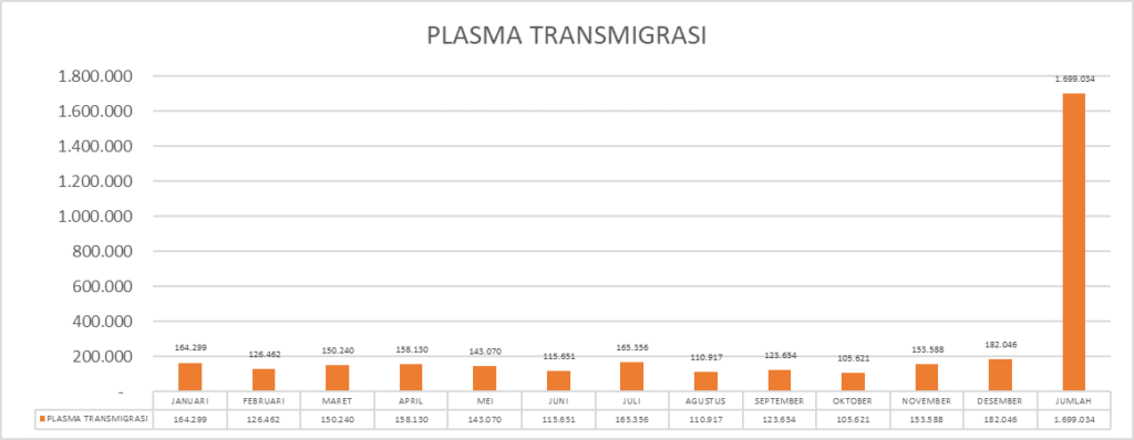 Produksi tertinggi Plasma Transmigrasi terjadi pada bulan Desember dengan capaian 182.046 kilogram, disusul bulan Juli sebesar 165.356 kilogram. Adapun produksi terendah tercatat pada bulan Oktober, yaitu 105.621 kilogram.